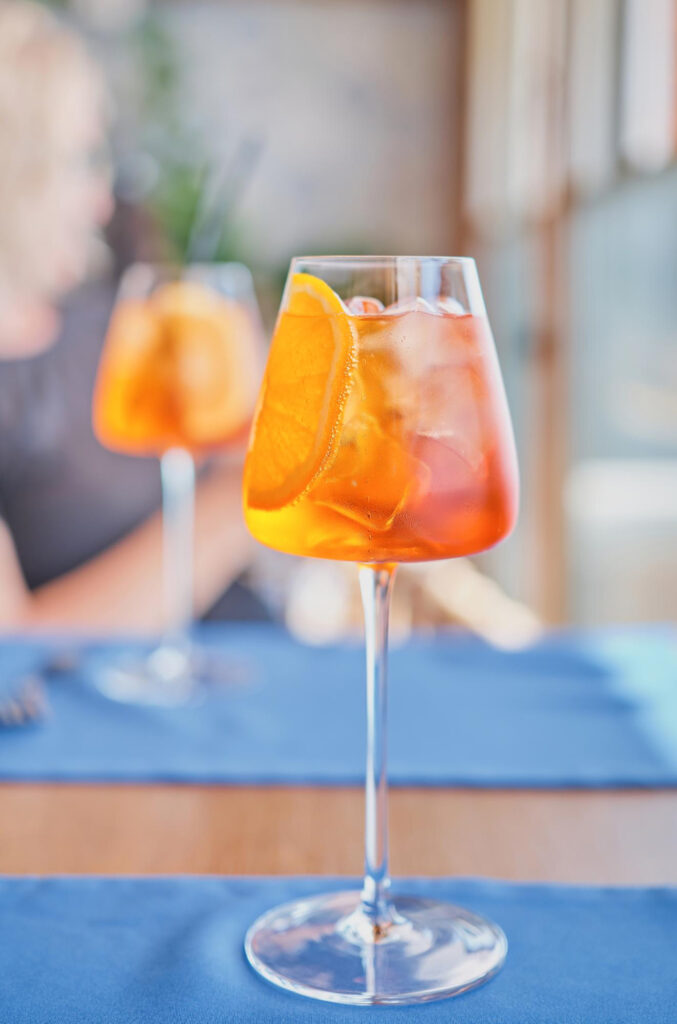 In recent years, the aperitivo has changed again and become “apericena”. Instead of just a drink and a few snacks, people enjoy a buffet with cold and hot food. For some, it replaces dinner; for others, it’s simply a longer aperitivo. Either way, the Spritz is always in the center of the table.